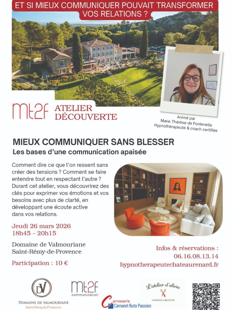 Je suis heureuse de vous proposer un nouveau format d’ateliers, organisé en partenariat avec le Domaine de Valmouriane à Saint‑Rémy‑de‑Provence. Dans ce cadre privilégié, ce cycle de rencontres vous invite à explorer votre manière de communiquer, à mieux comprendre les mécanismes relationnels et à développer des relations plus sereines et authentiques.